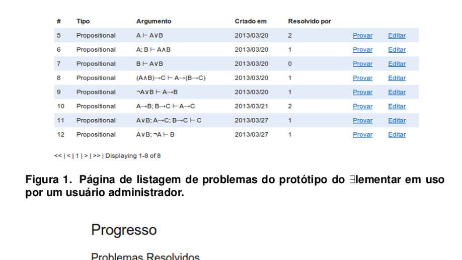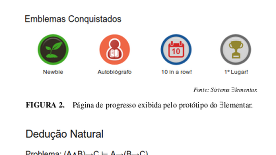 A lógica formal possui um papel fundamental na ciência da computação. Infelizmente, se observa que a eficácia do processo de ensino-aprendizagem da lógica formal tem se mostrado abaixo do ideal. Este trabalho apresenta o sistema ∃lementar, um sistema que incorpora um assistente de provas em um contexto de gamificação, i.e., que utiliza elementos de jogos para promover o engajamento e a motivação dos alunos. Após introduzir as caracterı́sticas gerais do sistema ∃lementar, este artigo apresenta dados preliminares que indicam melhoria nos indicadores de desempenho dos alunos.