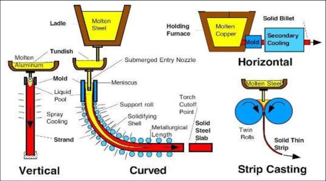 No processo de fundição contínua, o aço líquido é solidificado, dando origem a produtos semi-acabados (placas, tarugos, blocos, etc.). Estes serão reprocessados em etapas posteriores até que o produto final seja obtido. A solidificação do o aço líquido começa no molde e termina em um resfriamento secundário nos segmentos. No molde, o calor é extraído por condução através do contato entre aço líquido e as paredes do molde de cobre resfriado, formando uma superfície camada, a pele de aço solidificada. A solidificação avança da superfície para o centro do produto durante o resfriamento secundário, predominantemente por convecção – pulverizando a superfície do produto com jatos de água ou uma mistura de água e ar comprimido ou por radiação de calor.